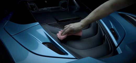 - Spray Swissvax Plastic Wash onto a clean Swissvax Micro-Wash microfibre cloth (yellow) or directly onto the plastic surface and spread evenly over the entire surface.